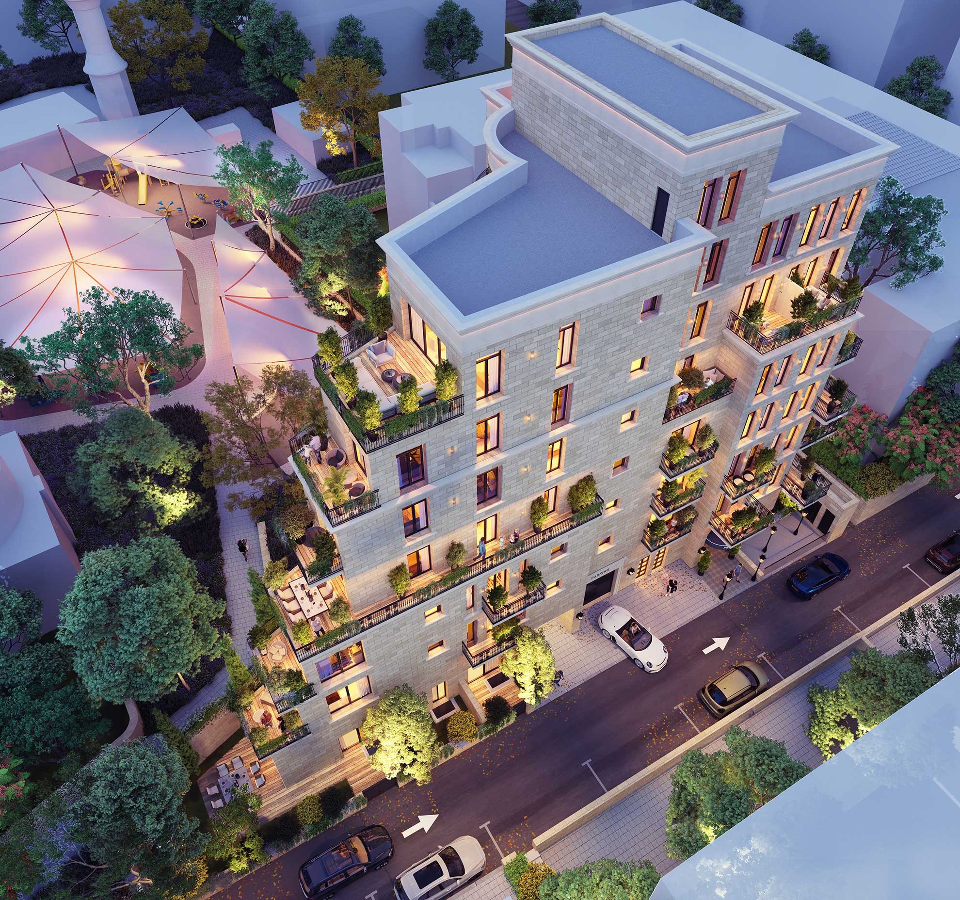 מבנה ישן להריסה במרכז העיר ירושלים צמוד לרחוב הנביאים פרויקט מגורים לתושבי חוץ בסגנון מלונאי 25 דירות יוקרה מעל 3 קומות חניה ומחסנים.